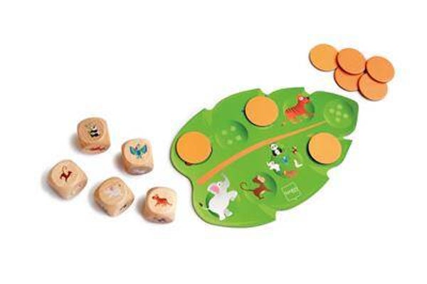 In deze vereenvoudigde variant van het wereldberoemde dobbelsteenspel Yahtzee, hoef je niet te kunnen lezen om te spelen. De dobbelstenen tonen plaatjes van leuke jungledieren. Probeer met de 5 dobbelstenen de uitdagingen op je plaatje te gooien. Vul als eerste een rij met kaartjes en win het spel. Ga voor snelle winst met de ‘yams’: wanneer je 5 keer hetzelfde dier gegooid hebt, ben je meteen de winnaar van het spel.
