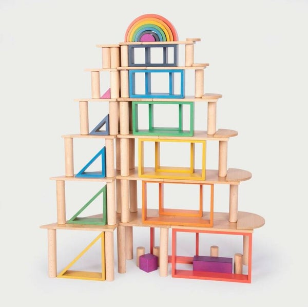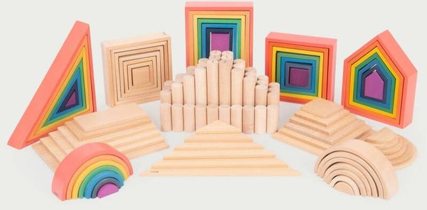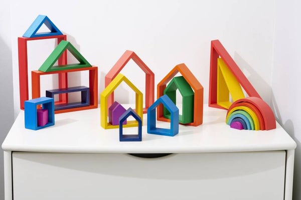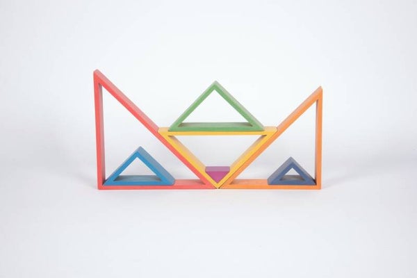 Onze Regenboog Houten Architect Driehoeken zijn gemaakt van prachtig glad massief beukenhout met een natuurlijke houtenerfafwerking in de zeven verschillende kleuren van de regenboog. De driehoeken nestelen zich samen als een set, waarbij het binnenste blok een solide 3D-driehoek is. Deze vormen set stelt je kind in staat om creativiteit en innovatie te ontgrendelen.