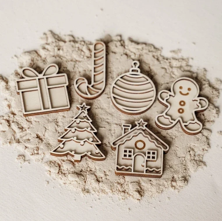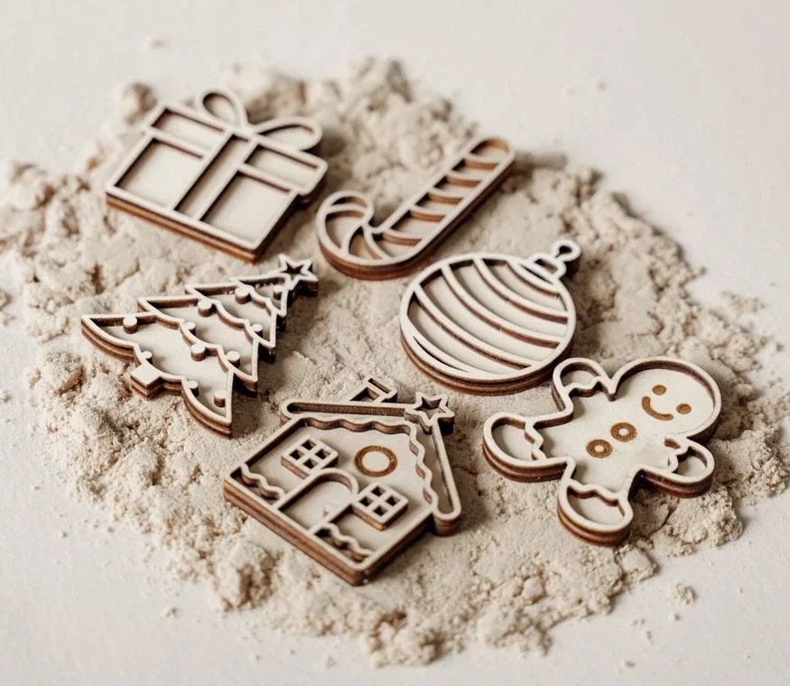 De Kerstmis set bestaat uit 6 items: Kerstboom Candy Cane Kerstbal Gingerman Kersthuisje Cadeau